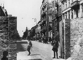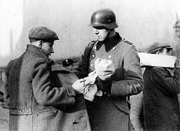 Un tedesco ed un poliziotto ebreo controllano uno degli ingressi del Ghetto.