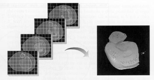 Lo scopo di questa operazione è di suddividere l’oggetto in sezioni altrimenti non disponibili (ortogonali e oblique), visualizzabili come immagini a livelli di grigio.