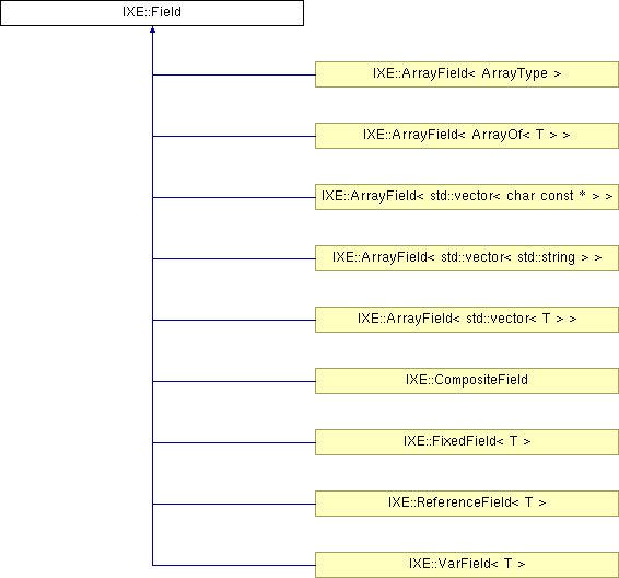 Implemented in IXE::CompositeField, IXE::FixedField< T >, IXE::VarField< T >, IXE::ReferenceField< T >, IXE::ArrayField< ArrayOf< T > >, IXE::ArrayField< std::vector< T > >, IXE::ArrayField< std::vector< std::string > >, IXE::ArrayField< std::vector< char const * > >, IXE::FixedField< T >, and IXE::FixedField< T >.