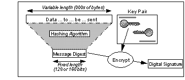 The sender generates a digest from the data and then encrypts it with its private key. It then sends the result, together with the public key, along with the data. The receiver uses the public key to decrypt the signature and then performs the same hashing function on the data. If the digest obtained matches the result of the decryption, the receiver knows: