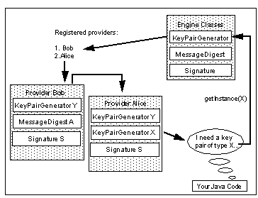 The figure shows two providers of cryptographic algorithms, Bob and Alice. These are in fact subclasses of the java.security.provider class. The acceptable algorithms are defined in engine classes . In JCA the only engine classes are related to digital signatures: creating the keys and digests needed for signing and then performing the signature itself. Bob and Alice both implement a number of algorithms that fall into these classes.