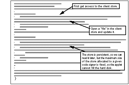 Not content with creating a method for delivering signed applets and requesting permissions, Microsoft has also produced classes that allow an applet to store and recover data from a limited disk cache on the browser. The rationale behind this is that for many developers the really irksome restriction imposed by the sandbox is the inability to store local configuration and state information.