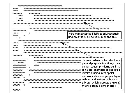 Now you are probably wondering why we requested access to read the local file but then did not do so. In fact we are going to need the file access later in the applet, in another thread. See GetFileNS.java (part 2 of 2) shows the second half of the applet, in which the FileRead privilege is used. This illustrates an oddity of the mechanism: the privilege manager grants privileges for the life of the applet, but the indicators are placed on the program stack, which is unique to each method and the methods it invokes. This means that you have to re-issue the enablePrivilege() request from the method where the privilege is actually exercised. However, as the privilege manager has kept track of what permissions have been granted, it will not ask the user again.