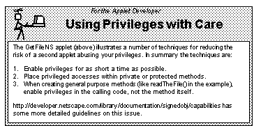 The package includes a large number of predefined privilege targets and also allows the programmer to register new targets. The applet shown in See GetFileNS.java (Part 1 of 2) requests access to two of the standard targets: access to system properties and read access to a local file.