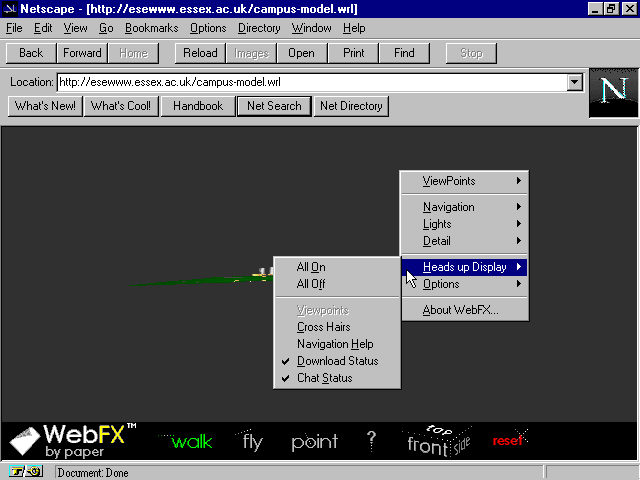 If you turn on the Heads up display, WebFX gives you hints about how to navigate the VRML world.