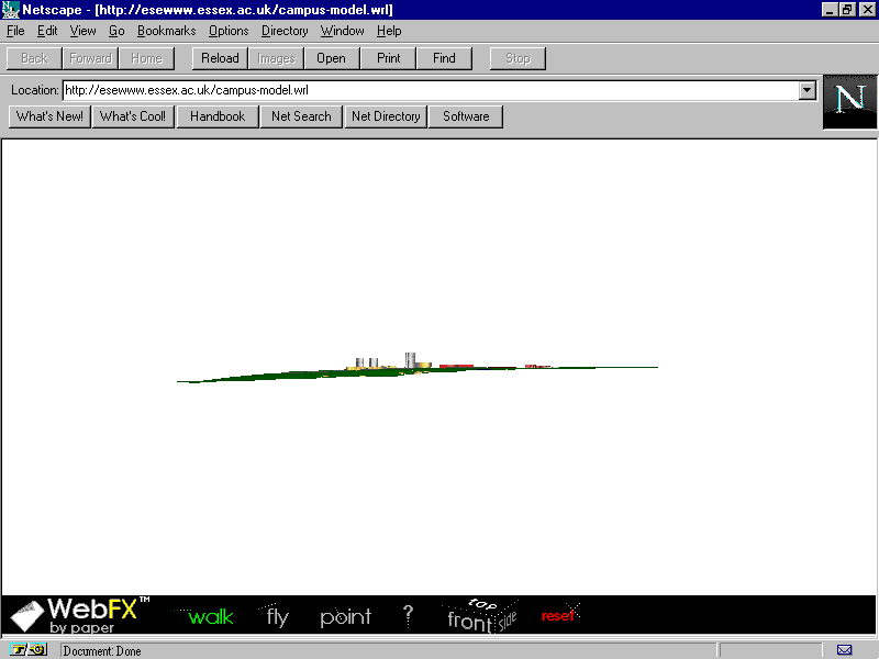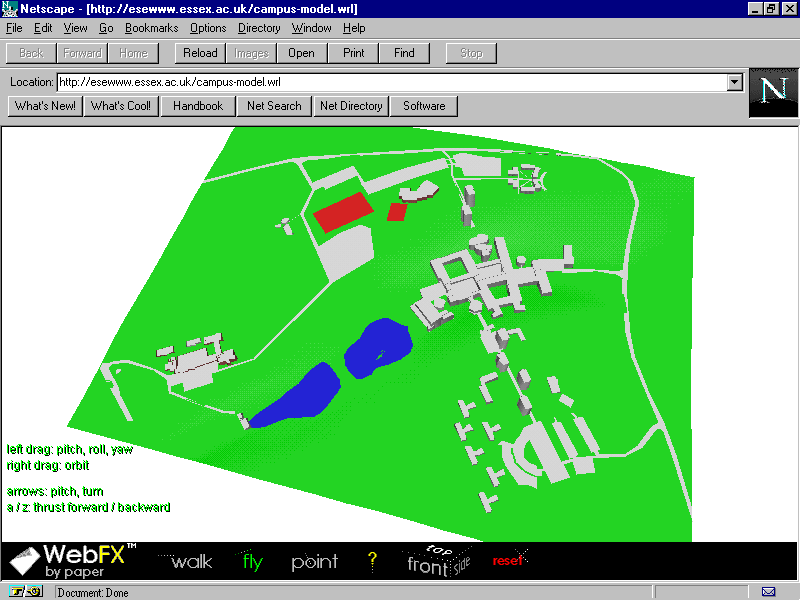 Because the VRML world is a three-dimensional model, you can look at it from any angle, including from below (which isn't very helpful) and from above, as shown in figure 17.17, giving you a useful map of the University of Essex campus.