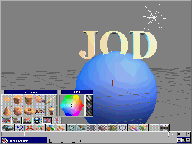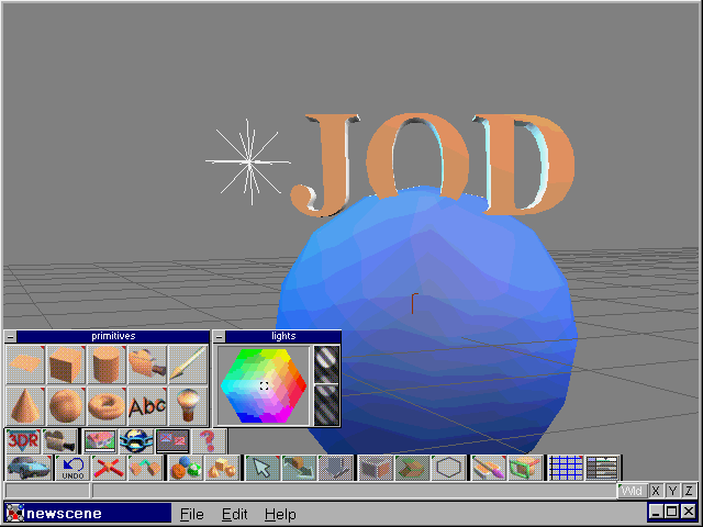 This example creates multiple objects and gives an idea of how to manipulate light sources and change the color of objects. In this one, we attempt to achieve a similar effect to the Netscape "N" world shown at the beginning of the chapter.