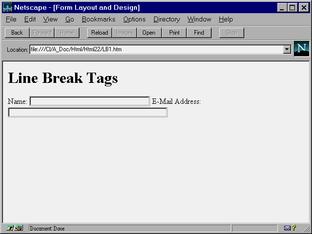 <HTML> <HEAD> <TITLE>Form Layout and Design</TITLE> </HEAD> <BODY> <H1>Line Break Tags</H1> <FORM> Name: <INPUT NAME="name" SIZE="30"><BR> E-Mail Address: <INPUT NAME="email" SIZE="40"> </FORM> </BODY> </HTML>