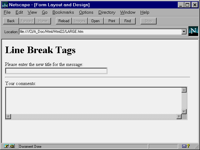<HTML> <HEAD> <TITLE>Form Layout and Design</TITLE> </HEAD> <BODY> <H1>Line Break Tags</H1> <FORM> Please enter the new title for the message:<BR> <INPUT NAME="name" SIZE="40"> <HR> Your comments:<BR> <TEXTAREA ROWS="6" COLS="70"></TEXTAREA> </FORM> </BODY> </HTML>