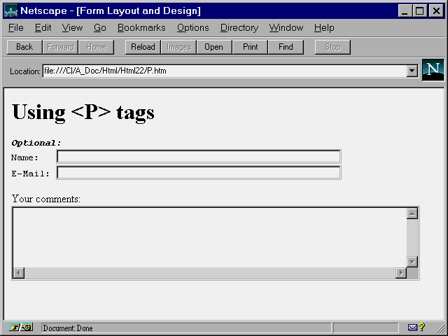 <HTML> <HEAD> <TITLE>Form Layout and Design</TITLE> </HEAD> <BODY> <H1>Using <P> tags</H1> <FORM> <PRE> <I><B>Optional:</B></I> Name: <INPUT TYPE="text" NAME="name" SIZE="50"> E-Mail: <INPUT TYPE="text" NAME="email" SIZE="50"> </PRE><P> Your comments:<BR> <TEXTAREA ROWS="6" COLS="70"></TEXTAREA> </FORM> </BODY> </HTML>