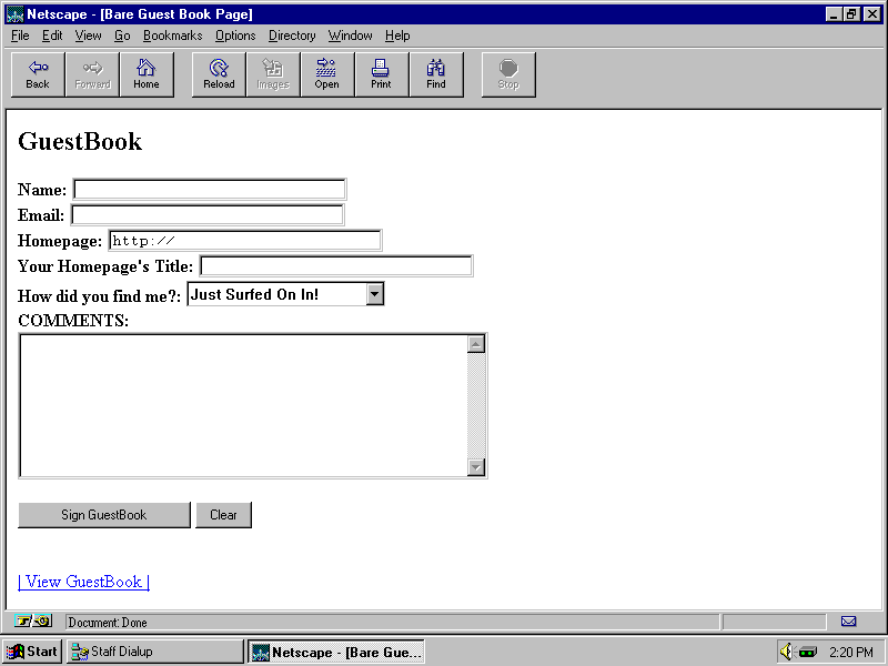 <HTML> <HEAD> <TITLE>Fancy Guest Book Page</TITLE> </HEAD> <BODY> <BODY BGCOLOR="#FFFFFF"> <CENTER> <form action="http://complete/file/path/gbookfancy.pl" method="POST"> <TABLE BORDER=10 CELLSPACING=10 CELLPADDING=2> <TR> <TH COLSPAN=2 ALIGN=CENTER>GuestBook<BR></TH> </TR><TR> <TD><B>Name:</B></TD> <TD><input name="name" size=30 maxlength=60><BR></TD> </TR><TR> <TD><B>Email:</B></TD> <TD><input name="email" size=30 maxlength=60><BR></TD> </TR><TR> <TD><B>Homepage:</B></TD> <TD><input name="homepage" value="http://" size=30 maxlength=60><BR></TD> </TR><TR> <TD><B>Your Homepage's Title:</B></TD> <TD><input name="hometitle" size=30 maxlength=60><BR></TD> </TR><TR> <TD><B>How did you find me?:</B></TD> <TD> <SELECT NAME="reference"> <OPTION>ListServe <OPTION>Student <OPTION>Search Engine <OPTION>NewsGroup <OPTION>Word of Mouth <OPTION>Advertisment/Brochure <OPTION>Personal Friend <OPTION selected>Just Surfed On In!</SELECT><BR></TD> </TR><TR> <TD COLSPAN=2> <B>COMMENTS:</B><BR> <TEXTAREA WRAP=VIRTUAL NAME="comments" COLS=50 ROWS=8></textarea><BR></TD> </TR><TR> <TD ALIGN=CENTER> <input type="submit" value="Sign GuestBook"></TD> <TD ALIGN=CENTER> <input type="reset" value="Clear"></TD> </TR> </TABLE> </form> <BR> <A HREF="gbookfancy.html">| View GuestBook |</A> </CENTER> </BODY> </HTML>