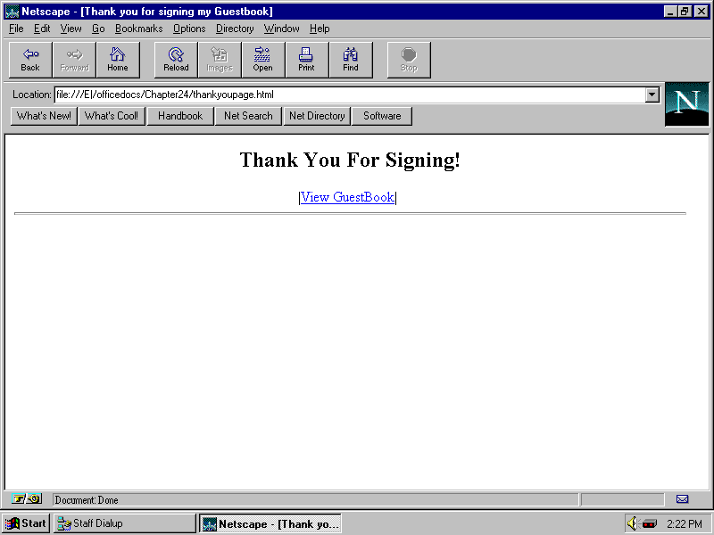 guestbook, and they signed it too, then when you reload the page, you see their responses on the page also. With a little modification of the guestbook's format, these responses easily become live chat. Each guest simply refreshes the response page, reads the current reply, and then sends in his or her own comments to be added to the page.