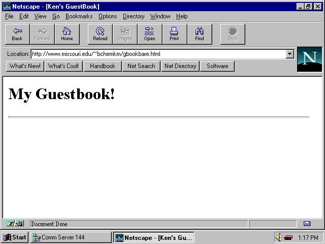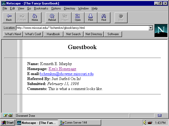 For example, if you visit my guestbook at http://www.missouri.edu/~bchemkm/guestbook.htm and take a peek at the source code, you see a line similar to the following: