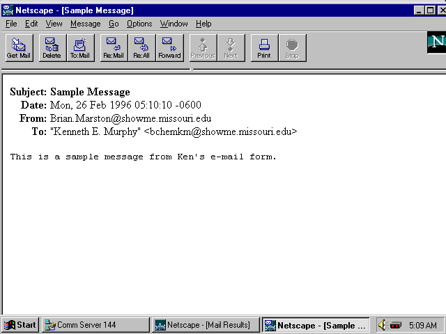 <HTML> <HEAD> <TITLE>E-Mail Form</TITLE> </HEAD> <BODY TEXT="#000000" BGCOLOR="#FFFFFF"> <CENTER> <!--The action attribute below must be set to the correct URL--> <!--for the place you put the email.pl file on your server.--> <FORM METHOD="POST" ACTION="http://www.missouri.edu/bchemkm-bin/email.pl"> <TABLE BORDER=10 CELLSPACING=10 CELLPADDING=2> <TR> <TH COLSPAN=2>E-Mail Form<BR></TH> </TR><TR> <TD ALIGN=RIGHT><B>Name of Sender:</B></TD> <TD><INPUT SIZE=40 TYPE="text" NAME="from"><BR></TD> </TR><TR> <TD ALIGN=RIGHT><B>Subject:</B></TD> <TD><INPUT SIZE=40 NAME="subject"><BR></TD> </TR><TR> <TD COLSPAN=2 ALIGN=CENTER><B>Body of Mail:</B><BR> <TEXTAREA WRAP=VIRTUAL NAME="message" COLS=50 ROWS=10></textarea><BR></TD> </TR><TR> <TD ALIGN=CENTER><INPUT TYPE="submit" VALUE="Send Mail"></TD> <TD ALIGN=CENTER><INPUT TYPE="reset" VALUE="Clear"><BR></TD> </TR> </TABLE> </FORM> </CENTER> </BODY> </HTML>