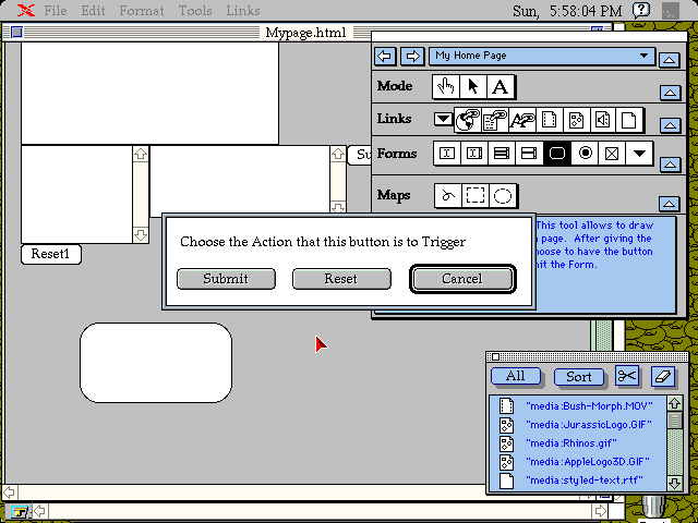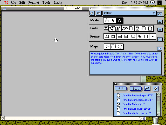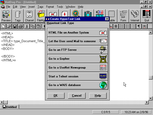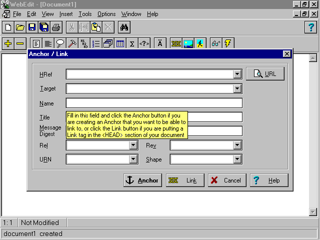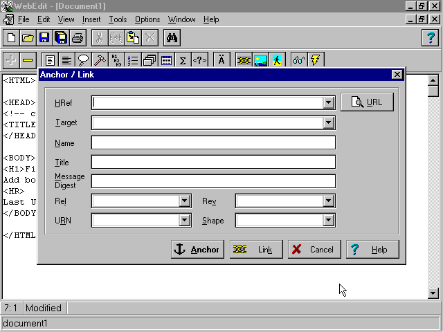 Probably one of the most common HTML element you'll want to utilize is the hyperlink. This is done by simply clicking the Hyperlink button on the toolbar. Once you've done that, you'll be presented with a dialog box (see fig. 30.47). Most of the time, you simply enter a URL for the Link Destination field and click the OK button. You can specify the values for as many attributes as you want, and they will all be incorporated into the link. If you want to access some more anchor attributes, just click the More button.
