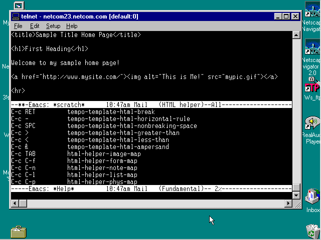 To start writing in HTML helper mode, simply have Emacs switch over to it. Traditionally, this is done by hitting the Esc and X keys and then typing html-helper-mode. As with some other Emacs modes, most html-helper-mode commands are accessible by first pressing Ctrl+C. After that, you can generally just hit the key that corresponds to the first letter of the HTML tag you want to use. For example, if you want to specify the title for your home page, hit Ctrl+C and then Ctrl+B followed by the T key. The cursor is placed in between the start and end marker, so you can type in the title.