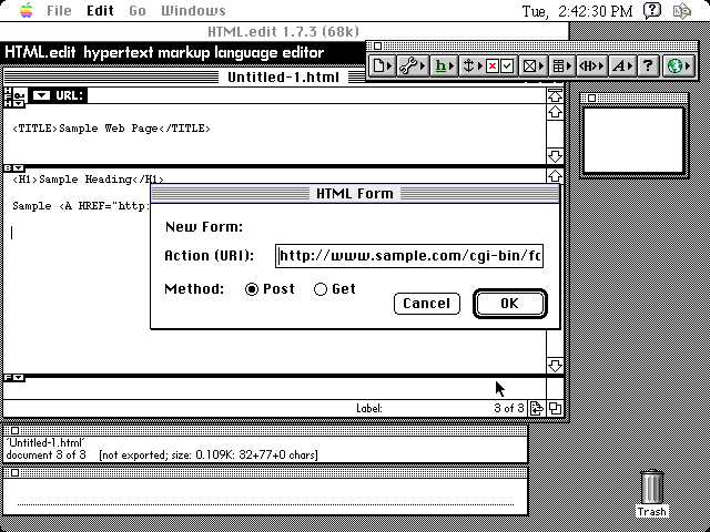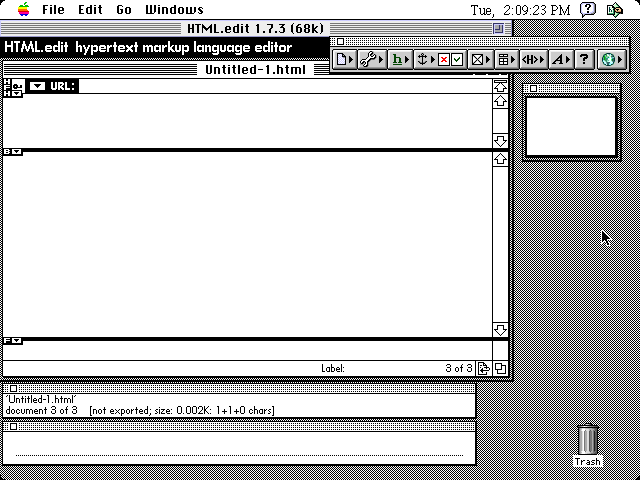 It has three distinct editing modes: text, HTML 2, and HTML 3. The text