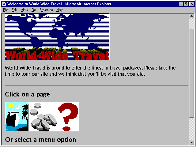 <HTML> <HEAD> <TITLE>Welcome to World-Wide Travel</TITLE> </HEAD> <BODY> <IMG SRC="logo.jpg" ALT="World-Wide Travel"> <P> World-Wide Travel is proud to offer the finest in travel packages. Please take the time to tour our site and we think that you'll be glad that you did. <P> <HR> <H3>Click on a page</H3> <IMG SRC="menumap.gif" USEMAP="menumap"> <MAP Name="MENUMAP"> <AREA SHAPE="RECT" COORDS="0,0,75,90" HREF="destination.html"> <AREA SHAPE="RECT" COORDS="80,0,170,90" HREF="specials.html"> <AREA SHAPE="RECT" COORDS="171,0,135,90" HREF="moreinfo.html"> </MAP> <H3>Or select a menu option</H3> <P> <A HREF="Destination.htm">[Destinations]</A> <A HREF="specials.htm"> [Specials]</A> <A HREF="moreinfo.htm">[More information] <P> <HR> <H6>©1996 World-Wide Travel</H6> </BODY> </HTML>