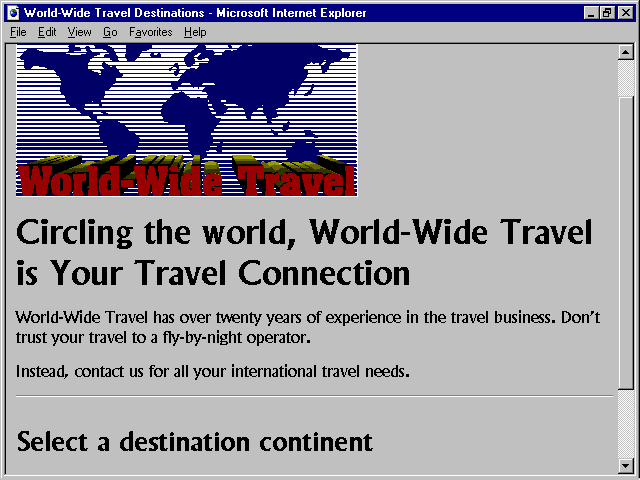 <HTML> <HEAD> <TITLE>World-Wide Travel Destinations</TITLE> </HEAD> <BODY> <IMG ALIGN=bottom SRC="logo.gif"> <H1>Circling the world, World-Wide Travel is Your Travel Connection</H1> World-Wide Travel has over twenty years of experience in the travel business. Don't trust your travel to a fly-by-night operator. <P>Instead, contact us for all your international travel needs. <HR> <H2>Select a destination continent</H2> <A HREF="europe.htm"> [Europe] </A> <A HREF="asia.htm"> [Asia] </A> <A HREF="samer.htm"> [South America]</A> <HR> <P> <H6>©1996 World-Wide Travel</H6> </BODY> </HTML>
