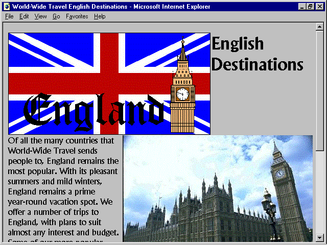 <HEAD> <TITLE>World-Wide Travel English Destinations</TITLE> </HEAD> <BODY> <IMG ALIGN=left SRC="england.jpg"> <H1>English Destinations</H1> <P> <IMG ALIGN=right SRC="london.jpg"> Of all the many countries that World-Wide Travel sends people to, England remains the most popular. With its pleasant summers and mild winters, England remains a prime year-round vacation spot. We offer a number of trips to England, with plans to suit almost any interest and budget. Some of our more popular trips are listed here. <P Align = right> <Table Border> <Caption><H3>Spring 1996 English Travel Packages<H3></Caption> <TR> <TH>Length Days/Nights</TH> <TH>Cities</TH> <TH>Sights</TH> <TH>Price</TH> </TR> <TR> <TD>3/4</TD> <TD>London</TD> <TD>The Tower, the British Museum, 221B Baker Street</TD> <TD>$1,750</TD> </TR> <TR> <TD>5/6</TD> <TD>Oxford</TD> <TD>Stratford upon Avon, Stonehenge, Rollright Stones, Oxford University</TD> <TD>$2,250</TD> </TR> </Table> <HR> <H6>©1996 World-Wide Travel</H6> </BODY> </HTML>