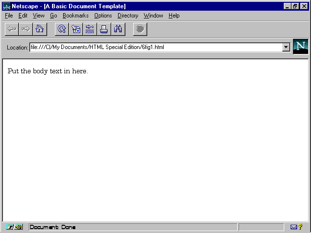 <HTML> <HEAD> <TITLE> A Basic Document Template </TITLE> <HEAD> <BODY> Put the body text in here. </BODY> </HTML>