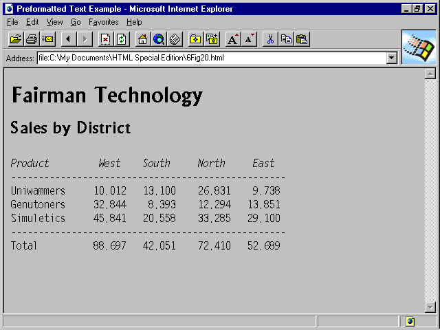 Figure 6.20 shows an example of some preformatted text in an editor. You can use the editor to line up the columns neatly before adding the character formatting tags. The result of this document is shown in figure 6.21.