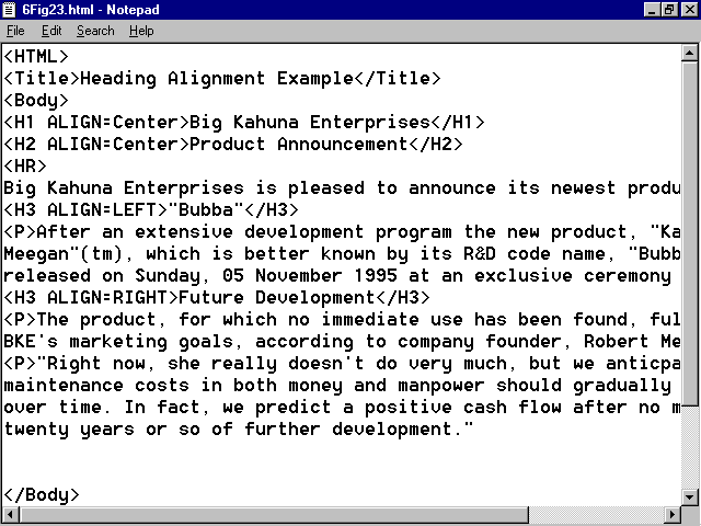 Alignment is specified for headings in the same way that it is for paragraphs, using the ALIGN attribute. The acceptable choices for heading alignment are left, right, center, and justify. Setting alignment to justify will start the heading at the left margin and add spaces to fill the entire line length, if possible. Figure 6.23 provides examples of how to specify heading alignment, and figure 6.24 shows the results of these examples.