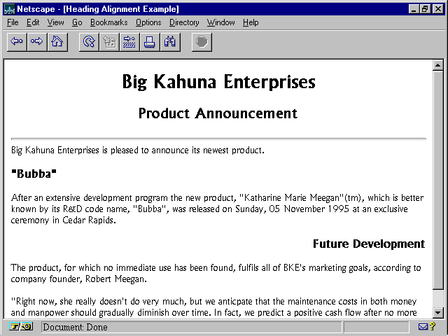 One of the biggest additions to the standard in the HTML 3.0 specification is the ability to control the positioning of text horizontally across the page. This will give you the option of placing your headings either against the left margin, in the center of the page, or against the right margin. The flexibility to locate your headings where you want them will enable you make your documents more appealing.