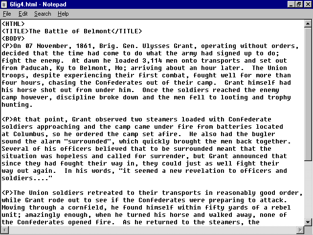Figure 6.4 shows what the document looks like in the editor after the paragraph tags have been added. You can see that the tags were added to the start of each paragraph and that the line feeds are still in the document. Because the browser ignores the line feeds anyway, it is best to keep them in the source document to make it easier to edit later.