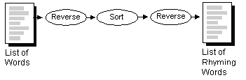 Next, we investigate a program that implements what's represented by the diagram in the previous figure. This program uses PipedReader and PipedWriter to connect the input and output of its reverse and sort methods in order to create a list of rhyming words. Several classes make up this program. This section shows and discusses only the elements of the program that read from and write to the pipes. Follow the code links presented here to see the whole program.