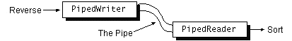 reverse starts a ReverseThread that writes its output to the PipedWriter and then returns the PipedReader to the caller. The caller then arranges for a sorting thread to read from it. The sort method is exactly the same, except that it creates and starts a SortThread.